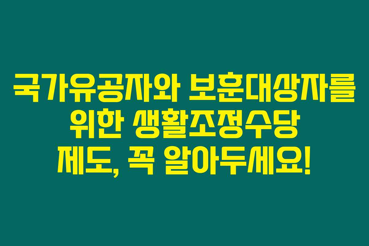 제가 리서치한 바로는 국가유공자와 보훈대상자를 위한 생활조정수당 제도가 많은 유공자 분들께 실질적인 도움이 되고 있다는 것을 느꼈어요. 이 제도는 경제적인 어려움을 겪고 있는 국가유공자들에게 생활비를 지원하여 안정적인 삶을 제공하는 것을 목적으로 하고 있습니다. 아래를 읽어보시면 이 제도의 구체적인 사항과 신청 방법에 대해 알게 될 것입니다.