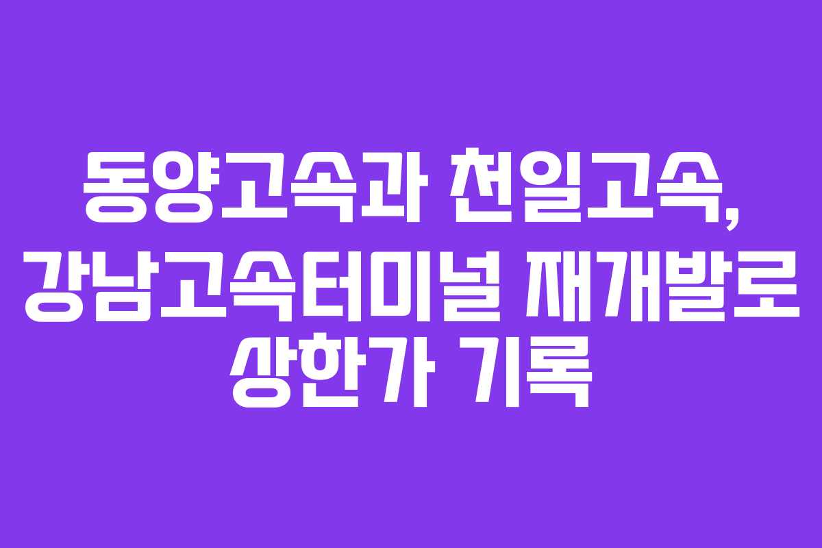 강남고속터미널의 재개발 소식이 전해지면서 동양고속과 천일고속의 주가가 급등하며 3일 연속 상한가를 기록했습니다. 이 두 회사는 서울고속버스터미널의 지분을 보유하고 있어 재개발 기대감이 주가에 긍정적인 영향을 미쳤습니다.