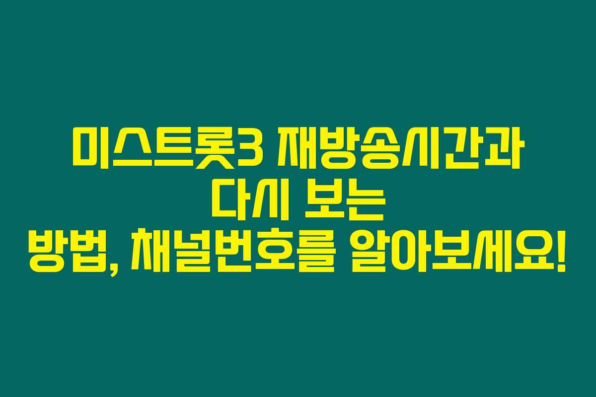 미스트롯3를 놓치셨다면 걱정하지 마세요! 재방송 시간과 다시 보는 방법을 알려드릴게요. 매주 목요일 밤 10시에 방송되는 미스트롯3는 많은 사랑을 받고 있기에 재방송을 통해 다시 즐기고 싶은 분들이 많죠. 그럼 미스트롯3의 재방송 시간과 시청 방법, 그리고 채널 번호를 상세히 알아보겠습니다.