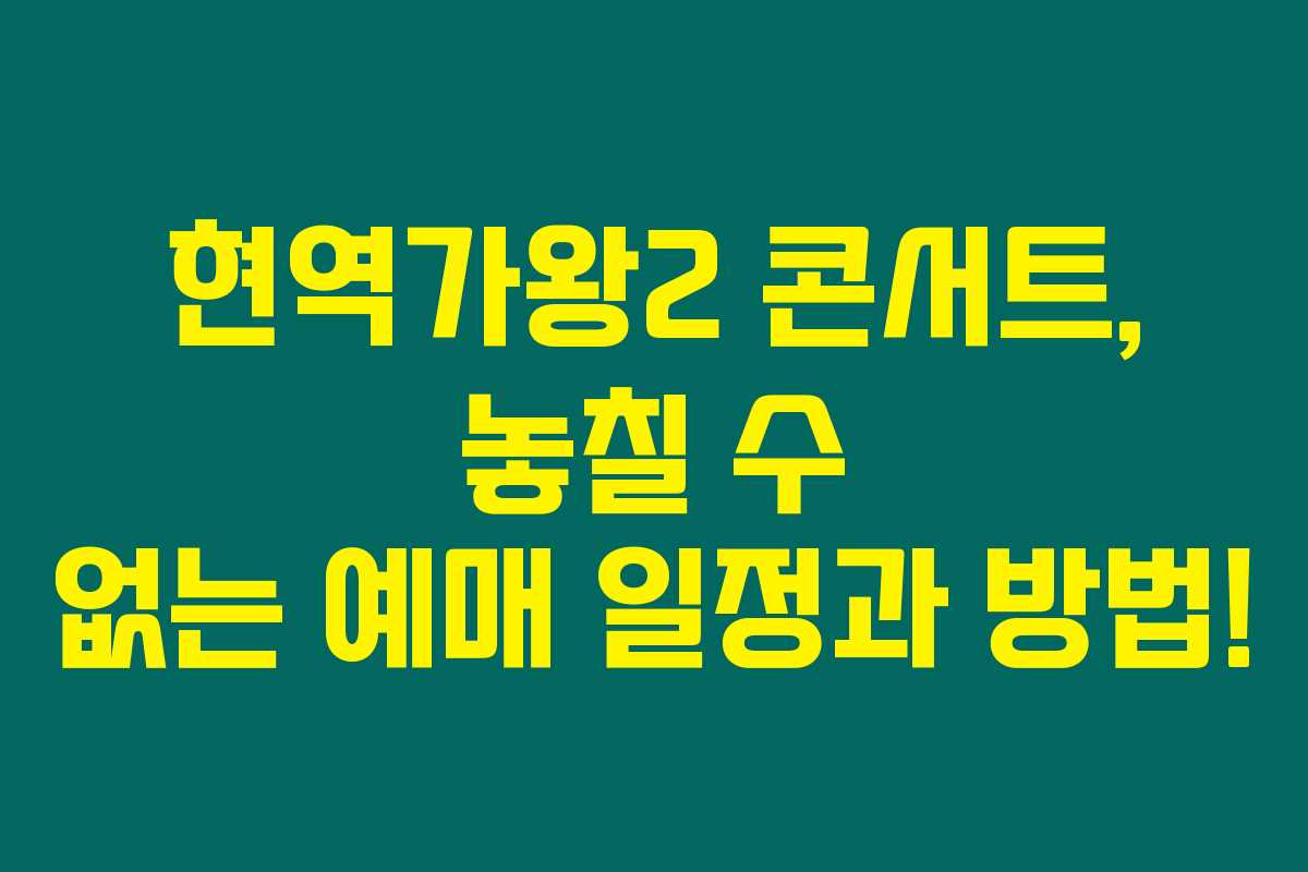 현역가왕2 콘서트 예매 일정과 방법을 미리 확인하면 원하는 좌석에서 최고의 공연을 즐길 수 있어요. 매 회차 경쟁이 치열할 것으로 예상되니, 일정을 확인하고 빠른 예매를 추천합니다. 감동적인 무대를 현장에서 체험할 기회를 놓치지 마세요!
