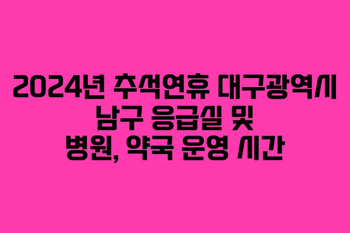 2024년 추석 연휴 동안 대구광역시 남구에서 운영되는 응급실, 병원 및 약국의 정보를 제공합니다. 지병이 있는 분이나 어린 자녀를 둔 가정에서는 이 정보를 참고하여 적절한 의료 서비스를 받는 것이 중요합니다.