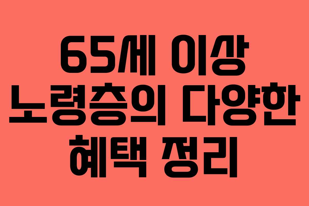 65세 이상 노령층을 위한 다양한 혜택이 있습니다. 이러한 복지 제도는 노년층의 경제적 부담을 덜기 위해 마련되었으며, 일부는 65세 미만도 혜택을 받을 수 있으니 적극 활용하시기 바랍니다.